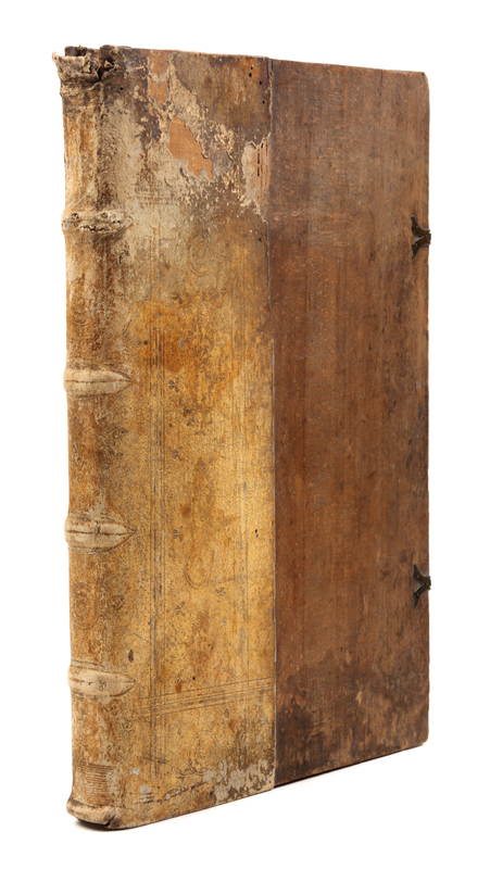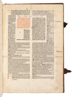 Folio (348 x 235 mm). Gothic types, text in two columns surrounded by 68 lines of commentary. COLLATION: a4 (with unsigned blank singleton inserted between a1 and a2) bb-mm8 nn8 (-n8, with index on recto): 104 leaves (lacking final index leaf, single blank leaf inserted between aa1 and aa2). Text printed in red and black, 3- to 5-line initials in red or blue, paragraph marks and initial strokes in red and blue. (Mostly marginal dampstaining, a few wormholes occasionally touching letters, first and final leaves outer margins frayed and with some worming or soiling.) Contemporary blind-tooled pigskin-backed wooden boards (some rubbing and wear, a few wormholes, short tears to head of spine); clasps and catches (one clasp detached, leather renewed). Provenance: Michaelsberg Abbey, Bamberg (inscription on first text leaf: "Ad Bibliothecam Mrij. S. Mich. Arch. Bamb. OSB."); notes and marginalia in an early hand.Later edition of Justinian's Roman Law. "No single authority has had greater influence in shaping the existing legal codes of all nations than the Roman Law; obvious in those which, like the Code Napolon, sought to impose a theoretic standpoint, it may be felt even in fundamentally empiric bodies of law like the English Common Law...When people speak of the Roman Law today, what they mean is Justinian" (PMM 4). RARE: according to American Book Prices Current, only one copy of this edition of Justinian's Institutiones has sold at auction in the last 40 years (Sotheby's London, 6 July 1982, lot 371). BMC III, 774; BSB-Ink C-652; Goff J530; GW 7615; Hain 9487.