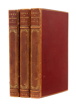 3 volumes, 12mo (164 x 100 mm). Half-titles, 1p. publisher's advertisements on verso of final leaf in vol. III, watermarks dated 1815. (Lacking final blank vol. I, a few minor stains.) 20th-century brown morocco gilt, edges gilt, stamp-signed by Riviere & Sons (upper cover to vol.I detached, some light wear to corners and joints). Provenance: C. E. Hay (early signature on half-titles); Eugene Grosman (bookplate).FIRST EDITION, with half-titles in each volume. In his review of Austen's novel, Sir Walter Scott comments, "we therefore bestow no mean compliment upon the author of Emma, when we say that... she has produced sketches of such spirit and originality that we never miss the excitation which depends upon the narrative of uncommon events." After numerous publishing delays, Austen self-financed the publication of Emma, paying printer John Murray a 10 percent commission and retaining the rest of the profits.