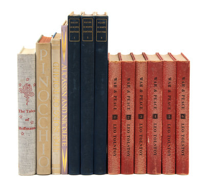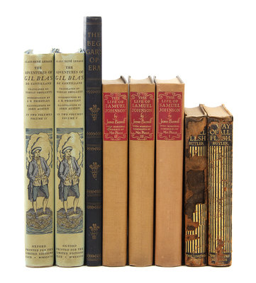 BOSWELL, James. The Life of Samuel Johnson. 1938. 3 volumes. -- BUTLER, Samuel. The Way of All Flesh. 1936. 2 volumes. -- COLLODI, C. Pinocchio. The Adventures of a Marionette. 1937. -- GAY, John. The Beggar's Opera. 1937. -- HOFFMAN, E.T.A. The Tales of Hoffman. New York: The Heritage Press, 1943. -- LANG, Andrew. Aucassin and Nicolete in English. 1931. -- [LESAGE, Alain-Rene]. Tobias SMOLLETT, translator. The Adventures of Gil Blas of Santillane. 1937. -- MALORY, Thomas Sir. Le Morte d'Arthur. 1936. 3 volumes. -- MONCRIEFF, Charles Scott. The Songs of Roland. 1938. -- TOLSTOY, Leo. War and Peace. 1938. 6 volumes. -- Together 10 works in 21 volumes, publisher's bindings.