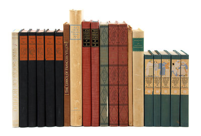 Frances WINWAR, translator. The Decameron of Giovanni Boccaccio. 1930. 2 volumes. -- [CELLINI, Benvenuto]. John ADDINGTON SYMONDS, translator and editor. The Life of Benvenuto Cellini, Written by Himself. 1937. -- FRANCE, Anatole. The Crime of Sylvestre Bonnard. 1937. -- HUGO, Victor. Les Miserables. 1938. 5 volumes. -- LOTI, Pierre. An Iceland Fisherman. 1931. -- MONCRIEFF, Charles Scott. The Song of Roland. 1938. -- RABELAIS, Francois. Gargantua and Pantagruel; the Five Books. 1936. 5 volumes. -- [ROSSETTI, Dante Gabriel]. Algernon CHARLES, translator. The Lyrics of Francois Villon. 1933. -- ROSTAND, Edmond. Cyrano de Bergerac. 1936. -- Another copy. -- WILDE, Oscar. The Ballad of Reading Gaol. 1937. -- Together, 10 works in 20 volumes.