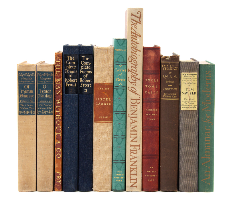 DREISER, Theodore. Sister Carrie. 1939. -- [FRANKLIN, Benjamin]. Edward, F. O'DAY, editor. The Autobiography of Benjamin Franklin. 1931. -- FROST, Robert. The Complete Poems of Robert Frost. 1950. 2 volumes. -- HALE, Edward Everett. The Man without a Country. 1936. -- MAUGHAM, W. Somerset. Of Human Bondage. 1938. 2 volumes. -- PEATTIE, Donald Culross. An Almanac for Moderns. 1938. -- STOWE, Harriet Beecher. Uncle Tom's Cabin; or, Life among the Lowly. 1938. -- THOREAU, Henry David. Walden; or, Life in the Woods. 1836. -- TWAIN, Mark. The Adventures of Tom Sawyer. 1939. -- WHITMAN, Walt. Leaves of Grass. 1929. -- Together, 10 works in 12 volumes.