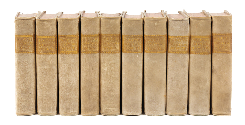 10 volumes, 8vo (160 x 96 mm). Engraved frontispieces, title-pages printed in red and black, engraved folding maps. Contemporary vellum. Provenance: Liechtenstein library (bookplates and shelf marks). This edition was edited and annotated by J. Clericus, and includes a 14 maps of the Roman empire. Schweiger 535.