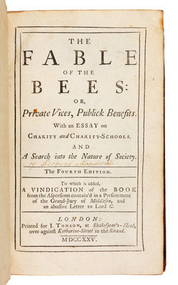 MANDEVILLE, Bernard (1670-1733). The Fable of the Bees; Or, Private Vices, Publick Benefits. London: J. Tonson, 1725-1729.