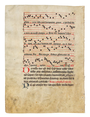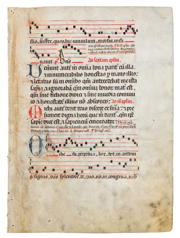 Lettered on two sides, 4to (344 x 252 mm). 5 two-line initials in red and blue, 9 staves of music.