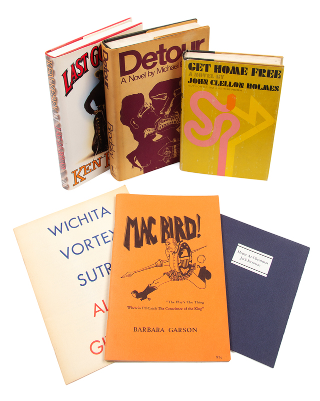 BRODSKY, Michael. Detour. New York: Urizen Books, 1977. FIRST EDITION, INSCRIBED BY BRODSKY. -- GARSON, Barbara. Mac Bird. Berkeley and New York: Grassy Knoll Press, 1966. -- GINSBERG, Allen. Wichita, Vortex, Sutra. San Francisco: City Lights Publishing Co., 1967. -- HOLMES, John Clellon. Get Home Free. New York: E. P. Dutton & Co., Inc., 1964. FIRST EDITION. -- KEROUAC, Jack. Home at Christmas. [New York: Designed and printed by Ronald Gordon, 1973]. -- KESEY, Ken and Ken BABBS. Last Go Round. New York: Viking, 1994. -- With 3 recordings (2 records, 1 cassette tape) with 6 additional works, together 12 works in 12 volumes, 12mo and 8vo, publisher's bindings, complete list available on request.
