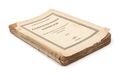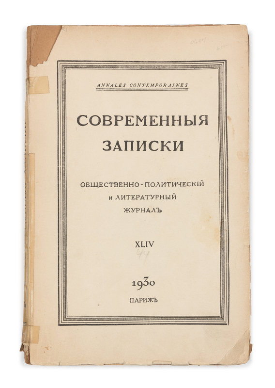 8vo (252 x 164 mm). Original wrappers (some chipping, occasionally with losses, particularly to corners and spine ends, a few old tape repairs to spine, hinge broken). FIRST APPEARANCE of Nabokov's shortest novel, which was first separately published in 1938. According to Nabokov's introduction to that edition, he wrote the text in 1930 in Berlin. Juliar C320. [With:] "Poety" ["The Poets"]. - "Iz komnaty v seni svecha perekhodit" ["From room to hallway a candle passes"]. In: Sovremnnye Zapiski [Contemporary Novels] No.69 Paris: July 1939. 8vo (244 x 160). Signed "Vasilii Shishkov." Original wrappers (some very light wear, early tape repair to foot of spine). RARE: According to American Book Prices Current, no copy of either of these works have appeared at auction in the last 45 years.