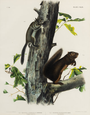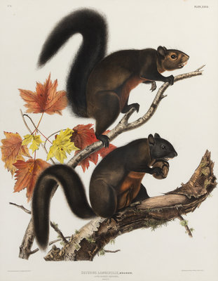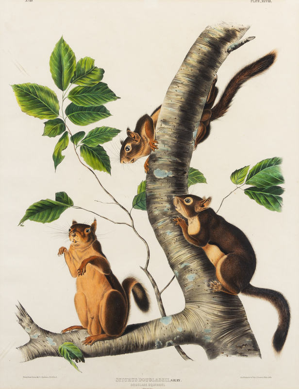 Long Haired Squirrel (Plate XXVII) Sciuris Longipilis. -- Douglass Squirrel (Plate XLVIII) Sciuris Douglassii, Gray. -- Fremont's Squirrel. Sooty Squirrel (Plate CXLIX) Sciuris Fremontii. Sciuris Fuliginosus.3 lithographs with hand-coloring, [Philadelphia, 1844, 1848], sheets approximately 30 1/4 x 20 1/2 in, some minor browning, matted and framed (not examined out of frame).