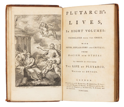 8 volumes, 8vo (177 x 107 mm). Engraved frontispiece by J. Miller after J. Thornhill in vol. I, engraved headpiece portraits. (Some light spotting.) Contemporary sprinkled calf, spines in 6 compartments with 5 raised bands, maroon and green lettering-pieces gilt in two, the rest gilt-decorated (some light overall wear, joints starting, lacking lettering-pieces to vol.I). Dryden oversaw a team of editors, including Thomas Creech, Paul Rycaut, and Richard Duke to translate Plutarch's Lives from the original Greek. The translation was first published in 1680, and remained the standard for nearly a century, until a new translation was completed by the Langhorne brothers. RARE: ESTC locates only 13 copies. ESTC N20531.