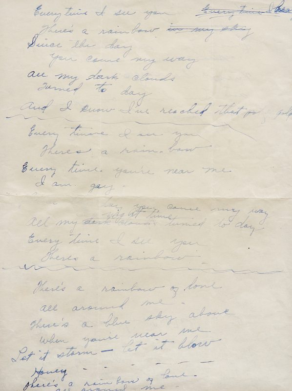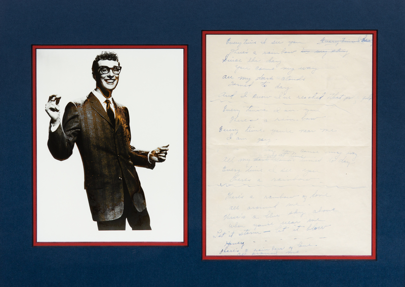 2 pages, 4to, in ink, creased, 3 words mostly effaced, matted and framed. 34 lines of unpublished lyrics, with numerous emendations. 31 lines of lyrics begin "Every time I see you / There's a rainbow". 3 lines on verso read: "Now one legged Joe / Rocking on his toe / Threw away his crutch and". Framed with a picture of Holly.