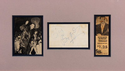 1 page, 16mo, in ink, matted and framed. Framed with a picture of The Big Bopper and a clipped newspaper announcement for a Big Bopper concert.