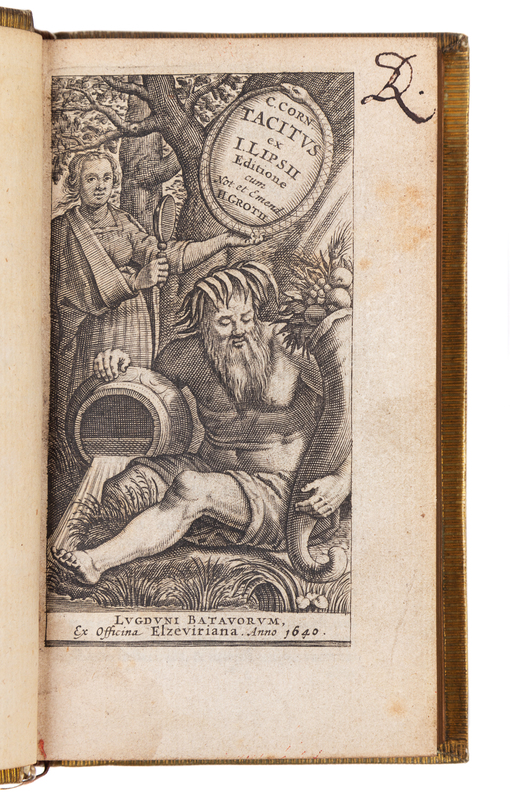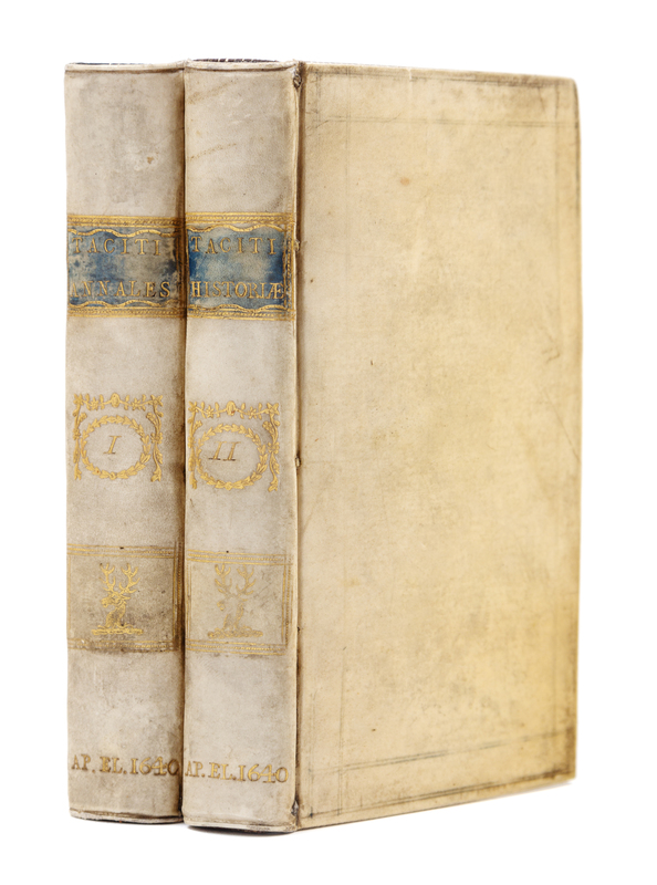 2 volumes, 12mo (128 x 72 mm). Engraved title to vol. I, engraved portrait of Tiberius Caesar, folding letterpress table, woodcut device on title to vol. II, woodcut headpieces and initials. (Table trimmed just shaving a few letters, Contemporary vellum gilt, smooth spine gilt-lettered on a blue wash background, gilt-numbered and gilt lettered at foot, gilt stag tooling, turn-ins gilt on a green wash background, edges gilt. Provenance: D.R. (early signature); R.W. Hay (stamp); James Roberton LLD (1821-1889) Scottish lawyer (bookplate); W.P. Dudley (noting a gift from A.G. Carey). "Of these elegant little editions [of Tacitus] that of 1640 is preferred on account of its having the notes of Grotius. It is one of the earliest Elzevir classics and a fine copy is very valuable" (Dibdin Classics vol.II, p.452).