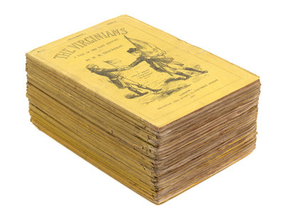 24 original parts, 8vo (224 x 144 mm). 48 etched plates, numerous woodcut vignettes in text. (Some spotting or browning, particularly to plates.) Original printed yellow wrappers (minor chipping to spine ends, some light soiling); quarter morocco slipcase. Provenance: Mrs. Wilson (contemporary signature in pencil on a few covers); S. Wartenberg (blind stamp on cover of part 22); Eugene Grosman (bookplate).FIRST EDITION IN PARTS, EARLY ISSUE with "actresses" instead of "ancestresses," on p. 207, line 33; and the errors in Part XII, with chapters XLVII-XLVIII mislabeled "XLVIII-XLIX." The Virginians Advertiser is present in each part (except part 24), as are most of the other inserted advertisements. Van Duzer 232.