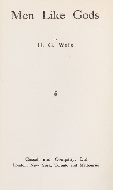 Men Like Gods. London: Castle and Company, 1923. Currey p.521 (Binding Variant A). -- The Food of the Gods and How it Came to Earth. London: Macmillan and Company, 1904. Currey p.519 (Binding A, mixed variant, top edge gilt, publisher's catalogue dated 20.9.04). -- In the Days of the Comet. London: Macmillan and Company, 1906. Currey p.519 (Issue B, variant 2). -- The Country of the Blind and Other Stories. London: Thomas Nelson and Sons, [1911]. Currey p.517. -- Together 4 works, 8vo, publisher's cloth, dust-jackets, ALL FIRST EDITIONS, condition generally good.
