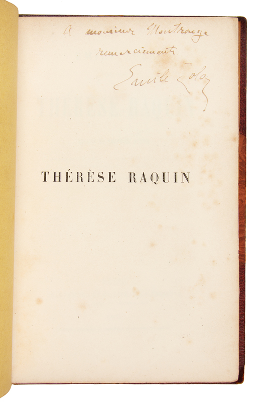 12mo (182 x 114 mm). (Some spotting.) 20th-century half crushed red levant; original wrappers bound in. Provenance: Monsieur Moutrouge (inscription by Zola); Marcel Silvain (bookplate); "E.M.H." (cipher on red morocco gilt bookplate). FIRST EDITION, INSCRIBED BY ZOLA: "a Monsieur Montrouge remerciements Emile Zola".