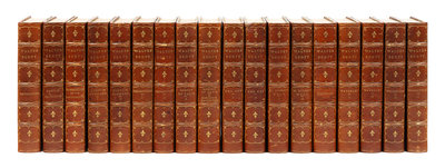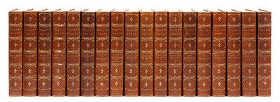 54 volumes, 8vo (218 x 140 mm). Engraved frontispieces, numerous plates and illustrations. (Scant offsetting.) Contemporary half green morocco gilt, top edges gilt, others untrimmed (spines slightly sunned, minor wear to joints or extremities). LIMITED EDITION, number 1 of 1,000 copies of the "New Abbotsford Edition."