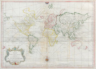 Engraved map of the world on Mercator's projection, image 500 x 700 mm (visible area 525 x 728 mm), hand-colored in outline, matted and framed. (Not examined out of frame, some minor toning, or spotting.) Decorative cartouche, compass, rhumb lines.