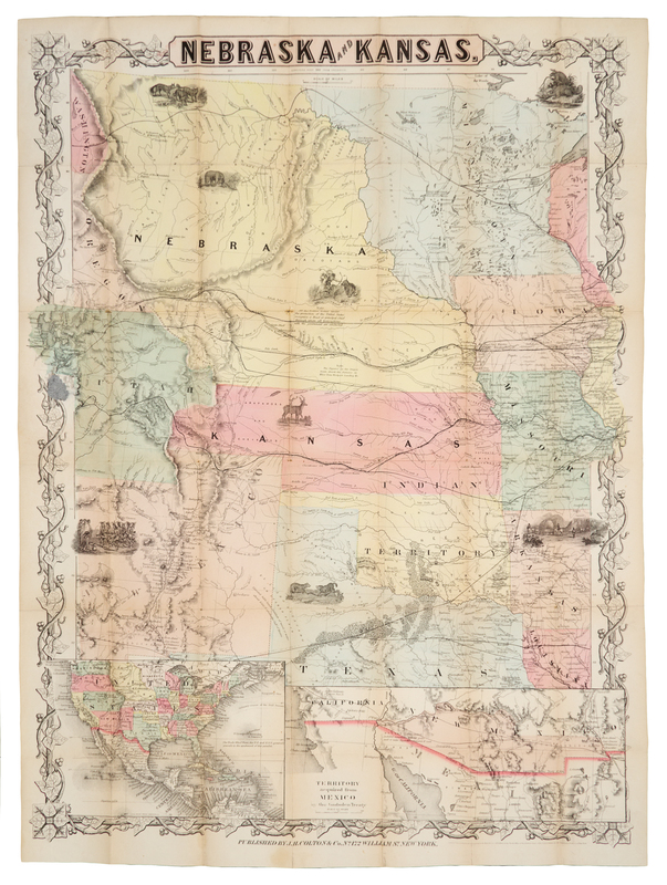 Engraved map with hand coloring, 737 x 544 mm sheet. Inset maps of the United States and the territory acquired in the Gadsden Purchase (1-in. hole with loss to left margin repaired, some slight browning or small splits to folds.) Second edition, incorporating a few small changes from the first edition of 1854, adding El Paso, Texas adn Nephi, Utah. With the inset maps of the United States and Gadsden Purchase largely unchanged from the first edition. Rumsey 5213.