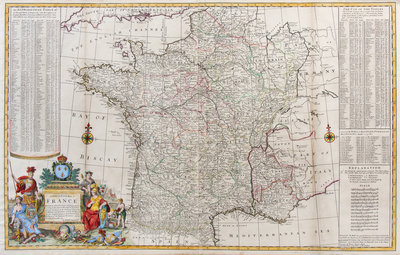 Engraved map of France, image 604 x 968 mm (sheet 628 x 995 mm) with hand-coloring. Allegorical cartouche depicting the arts, sciences, and viniculture, with the observatories at Paris and Greenwich visible in the background; also with alphabetical table, distance table, and list of ports of passage of the Pyrenees Mountains.