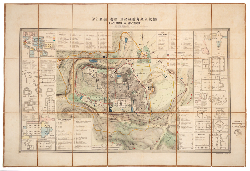 Engraved folding map, overall dissected in 21 sections and mounted on drab linen, image 553 x 917 mm (sheet 725 x 1050 mm), hand-colored. Wide side borders with architectural floorplans. PRESENTATION COPY, INSCRIBED BY ERMETE PIEROTTI TO ALEXANDRE DUMAS with an "Architetto Ingeonere di Terra Santa" stamp on lower right panel, and ADDITIONALLY INSCRIBED on label on verso. Laor, Maps of the Holy Land 1095.