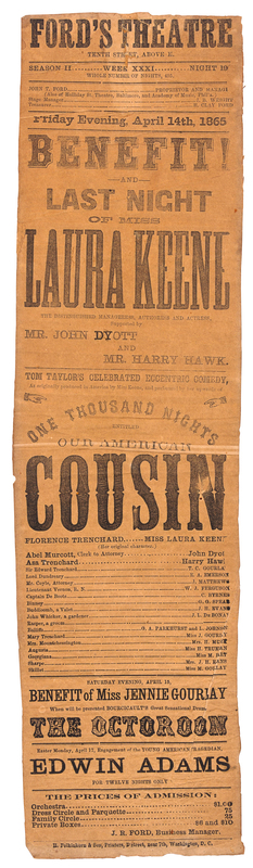 Folio broadside (460 x 122 mm), a few short tears at top with minor losses just affecting a few letters and old repair on verso, a few tiny marginal chips, overall browning from old framing. Provenance: Montgomery Blair (1813-1883) Maryland politician and lawyer, Postmaster General to President Lincoln; by descent to Montgomery Blair Jr.A CONTEMPORARY REPRINT BY THE ORIGINAL PRINTER OF THE APRIL 14 FORD'S THEATER PLAYBILL, FROM THE COLLECTION OF LINCOLN'S PRIOR POSTMASTER GENERALThe first edition of the April 14th Ford's Theater playbill is known in two distinct issues. On the morning of the 14th, H. Polkinhorn & Son printed a run of handbills for that evening's performance that was probably equivalent to the number of seats in the theater at the time. By mid-day, a messenger from the White House brought news that Lincoln had accepted an invitation to attend the play that night. In Lincoln' honor, the theater management decided to add the patriotic song "Honor To Our Soldiers" to the program for the evening. Polkinhorn reset part of the type for the handbill, adding the song. (Copies with this addition constitute the second issue). H. Pelkinhorn re-printed the first state of the playbill to satisfy the demand for souvenirs; these reprints have damage to the third "E" in the name "KEENE," as present in this copy.