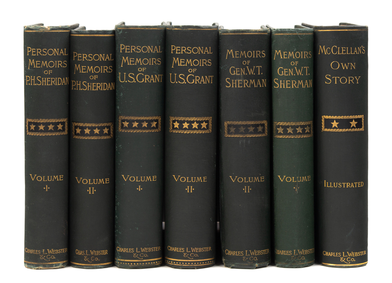 GRANT, Ulysses S. Personal Memoirs of U.S. Grant. 1885. 2 volumes. -- SHERMAN, William Tecumseh. Memoirs of Gen. W.T. Sherman, Written by Himself. 1891. 2 volumes. -- McCLELLAN, George B. McClellan's Own Story. The War for the Union, the Soldiers who Fought it, the Civilians who Directed it, and his Relations to it and to them. 1887. -- SHERIDAN, Philip Henry. Personal Memoirs of P.H. Sheridan. General United States Army. 1888. 2 volumes. -- Together 4 works in 7 volumes, 8vo, all published by Charles L. Webster & Company, all in publisher's green pictorial gilt-stamped cloth, condition generally fine.