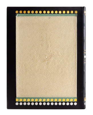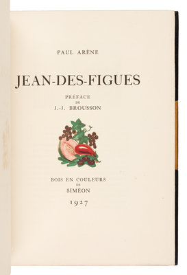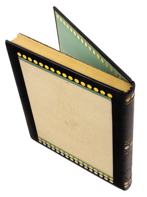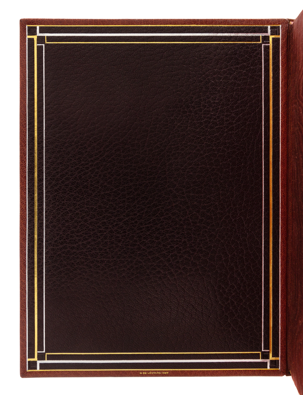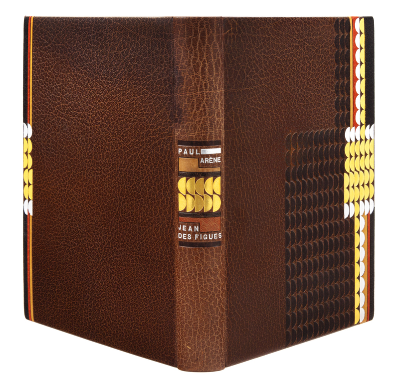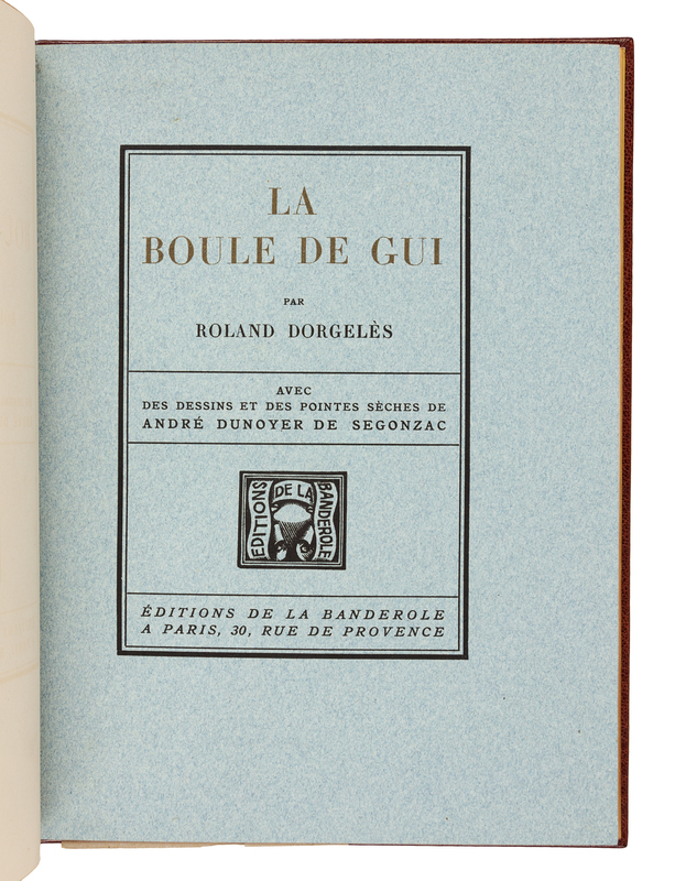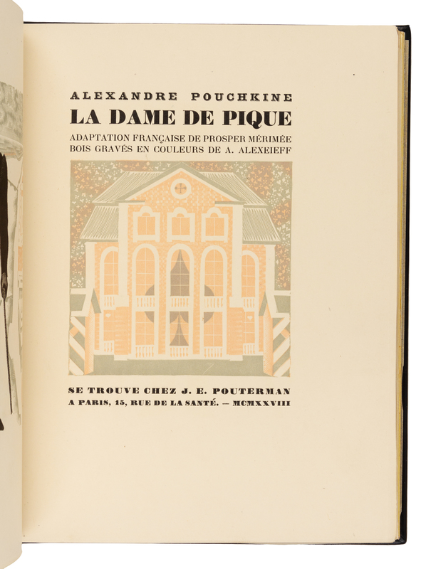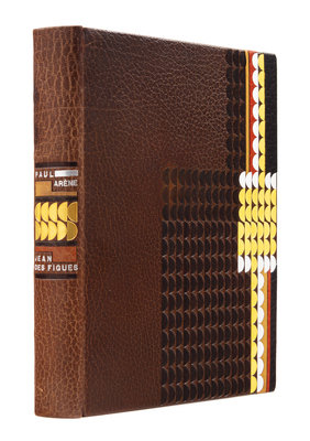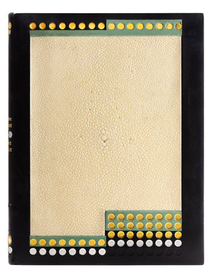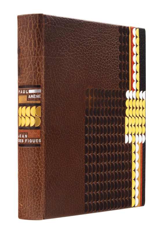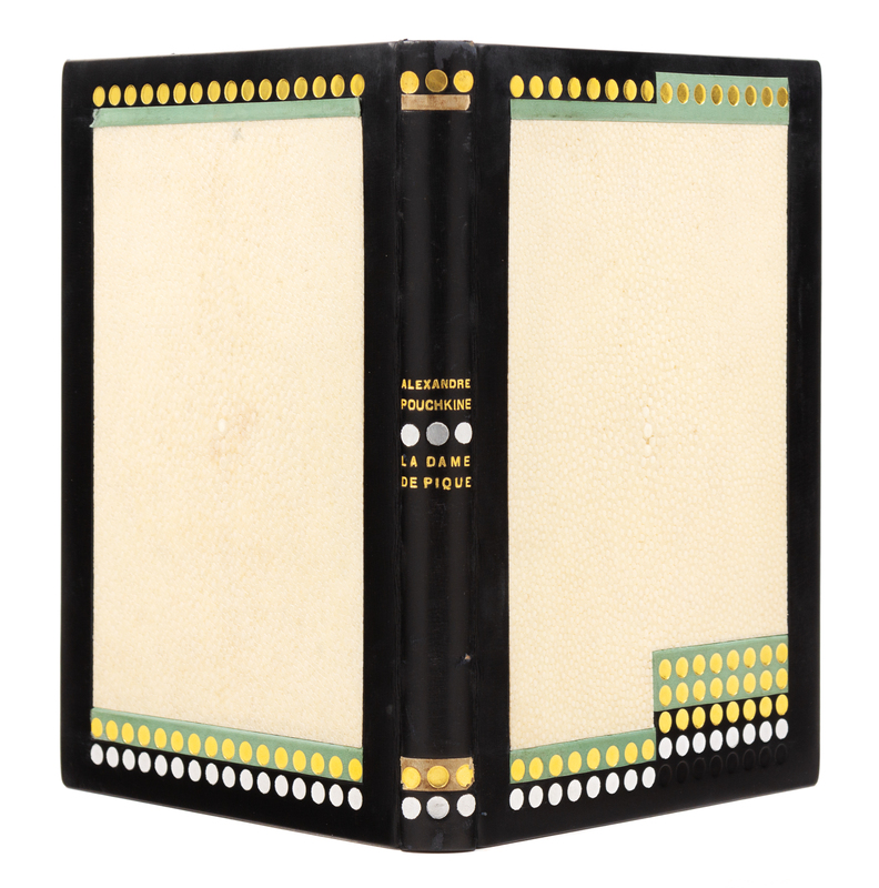 PUSHKIN, Alexander. La dame de Pique. Paris, 1928. Color-printed wood engravings by A. Alexeieff. Contemporary black calf, covers with central panel of white shagreen, green calf onlays, repeated circular pattern in gilt and silver, spine and green calf doublures similarly decorated, watered silk endleaves, marbled endpapers, signed by Lotard 1929. LIMITED EDITION, number 18 of 20 copies on Japon imperial with the wood-engravings in two states, of total edition of 219. -- DORGELS, Roland. La Boule de Gui. Paris, [1922]. Drypoint etchings, lithographed head- and tail-pieces by Andr Dunoyer de Segonzac; unsigned original drawing inserted. Contemporary brown crushed levant, upper cover with abstract rectilinear pattern in gilt, silver and black, spine and black crushed levant doublures similarly decorated, brown watered silk endpapers, marbled flyleaves, signed by Lotard 1927. Unnumbered copy "hors commerce" of an edition of 600. -- ARNE, Paul. Jean-Des-Figures. Paris, 1927. Color-printed wood engravings by Simon; original drawing tipped in. Contemporary brown crushed levant, covers with a repeated semicircle pattern in gilt, silver, and black, russet and black morocco and tan calf onlays, spine and russet doublures similarly decorated, brown watered silk endpapers, marbled flyleaves, signed by Lotard 1930. LIMITED EDITION, number 50 of 130 copies with an extra suite of plates and signed by the artist. -- Together 3 works, 4to, original slipcases, condition generally good with only minor scuffs or sunning.