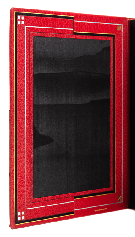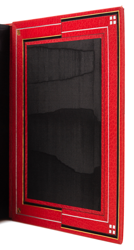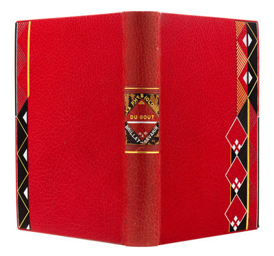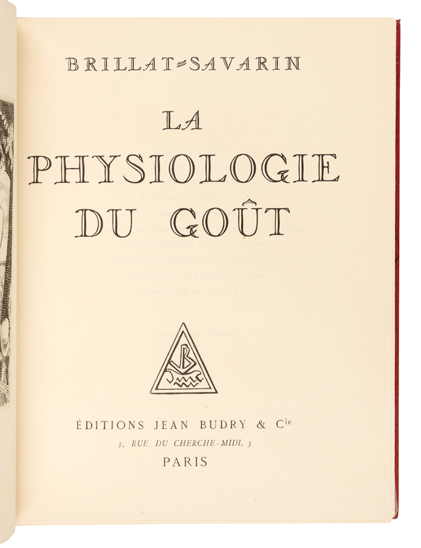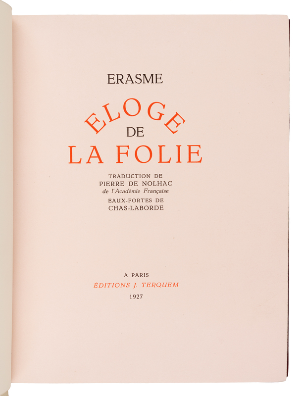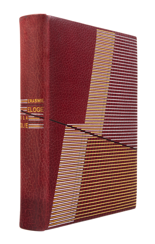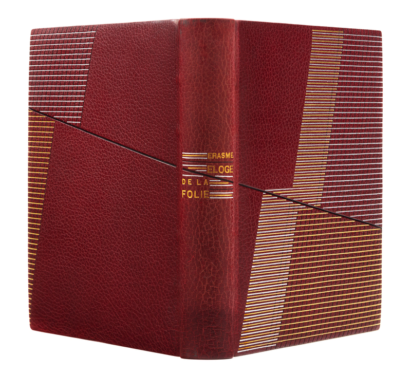 ERASMUS. Eloge de la folie. Paris, 1927. Etched plates, illustrations, and vignettes by Chas- Laborde. Maroon crushed levant, covers with abstract linear pattern in gilt, silver, and black, spine and tan calf doublures similarly decorated, maroon watered silk endleaves, marbled flyleaves, signed by Lotard 1929. LIMITED EDITION, number 71 of 109 numbered copies with an extra suite of the etchings hors-de-texte on india paper mounted, of a total edition of 130. -- BRILLAT-SAVARIN, Jean Anthelme. La physiologie du gout. Paris, [1926]. Two etched plates each present in two states. Crimson crushed levant, covers with abstract rectilinear pattern of gilt, silver, and blind with black calf onlays, spine and black calf doublures similarly decorated, black watered silk endleaves, marbled flyleaves, signed by Lotard 1928. LIMITED EDITION, number 9 of 10 numbered copies on Japon imperial, of a total edition of 400. -- Together 2 works, 4to, original slipcases, condition generally good with only minor scuffs or sunning.