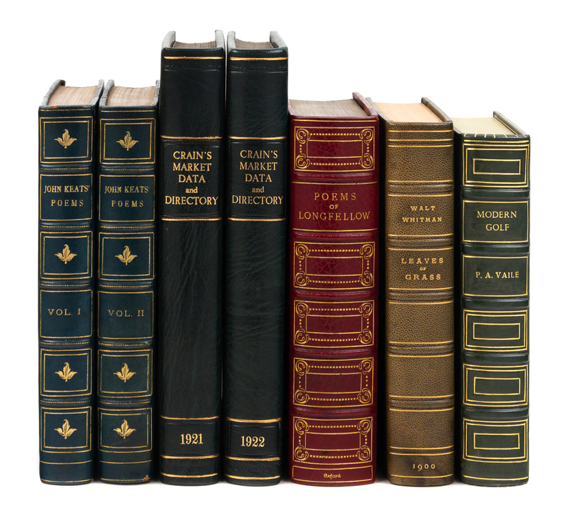 CRAIN, G.D. Jr. Crain's Market Data Book and Directory of Class, Trade and Technical Publications. Chicago: G.D. Crain, Jr., 1920-1921. 2 volumes. Contemporary green leather gilt, spine gilt-lettered, by Cat Tail Run Hand Bookbinding. -- KEATS, John. The Poems of John Keats. New York: Brentanos's, 1924. Period half blue morocco gilt, spines gilt, top edges gilt others uncut. -- LONGFELLOW, Henry Wadsworth. The Poetical Works of Henry Wadsworth Longfellow. London: Henry Frowde, 1910. Period half red morocco gilt, spines gilt, top edges gilt. Provenance: Sulgrave Boys' Club (stamp). "Oxford Edition." -- VAILE, P.A. Modern Golf. London: Adam and Charles Black, 1909. Period green calf gilt, spine gilt, all edges gilt. -- WHITMAN, Walt. Leaves of Grass. Philadelphia: David McKay, [1900]. Contemporary green morocco, spine gilt. -- Together 5 works in 7 volumes, 8vo, condition fine.