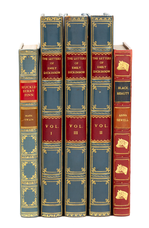 CLEMENS, Samuel ("Mark Twain"). The Adventures of Huckleberry Finn. London: J.M. Dent & Sons, Ltd., 1958. Contemporary blue calf gilt, red and brown leather lettering pieces gilt, all edges gilt, by Frost & Co. -- DICKINSON, Emily. The Letters of Emily Dickinson. Cambridge, MA: The Belknap Press of Harvard University Press, 1958. 3 volumes. Period half blue calf, spine gilt red leather lettering pieces gilt, top edges gilt, by Henry Sotheran, Ltd. -- SEWELL, Anna. Black Beauty. London: J.M. Dent & Sons, Ltd., 1950. Contemporary red calf, spines gilt, green and yellow leather lettering pieces gilt, all edges gilt, by Bayntun. -- Together 3 works in 5 volumes, 8vo, condition generally fine.