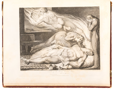 4to (348 x 277 mm). Etched portrait of Blake by L. Schiavonetti after T. Phillips, etched title-page, and 11 plates by Schiavonetti after Blake; text watermarked "Edmeades & Pine 1802" and "Edmeades & Co 1811." (Last plate disbound with margins frayed, some light browning or spotting.) Contemporary red roan-backed boards (worn). Second quarto edition, including Fuseli's introduction, which describes a profound appreciation for Blake's designs.