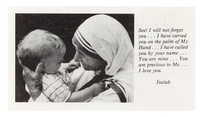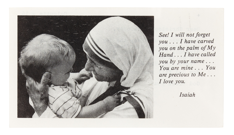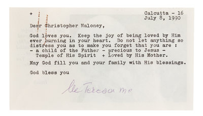 1 page, 12mo, on verso of printed card, paperclip burn, housed in Perspex case. Mother Teresa writes (in part): "God loves you. Keep the joy of being loved by Him ever burning in your heart."