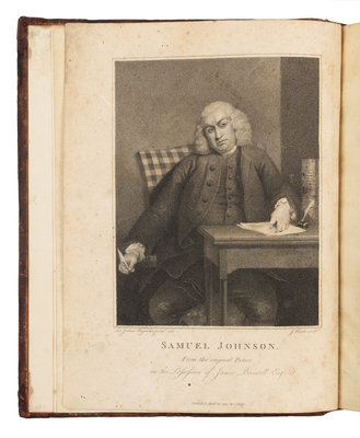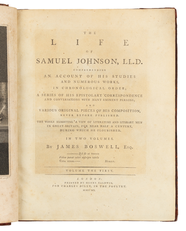 2 volumes, 4to (275 x 215 mm). Frontispiece portrait, 2 engraved plates, text to Life printed on blue paper, text for Corrections printed in two columns. (Some browning and spotting, without the blank A1 in the second volume, offsetting of portrait onto title.) Contemporary calf, spines in 6 compartments with 5 raised bands, tan and black morocco lettering pieces gilt, the rest gilt (carefully rebacked preserving original spines, endpapers renewed, covers detached vol. II). A. EDWARD NEWTON'S COPY. FIRST EDITION, second issue, with "give," cancels as usual and imprint below portrait intact. Boswell's biography, published 16 May 1791, achieved immediate acclaim; it has never been out of print. The Corrections was published concurrently with the second edition of the Life. ESTC T64481; Grolier English 65; Rothschild 463, 466; Pottle 79, 113.