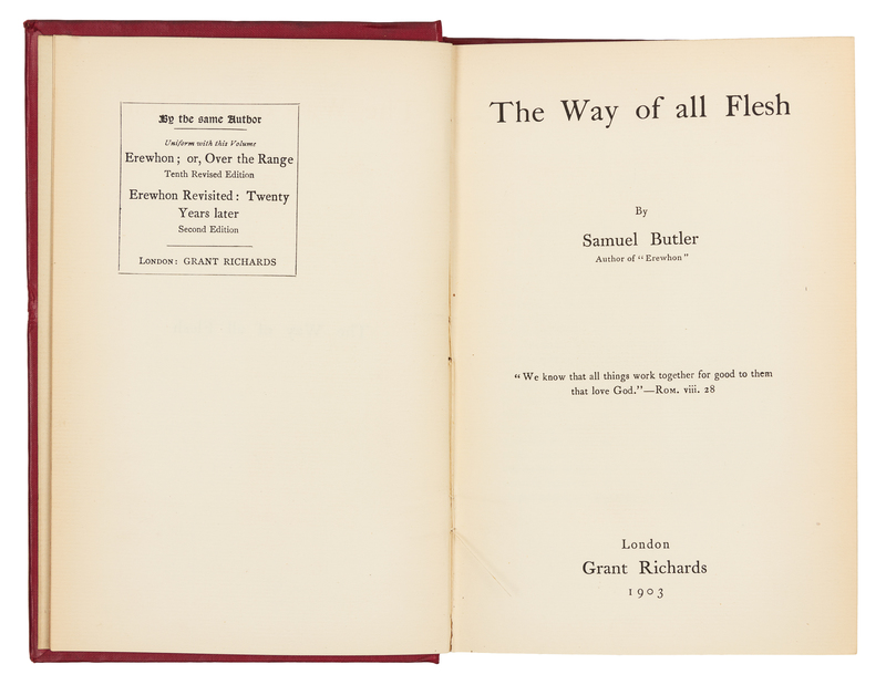 BUTLER, Samuel (1825-1902). The Way of All Flesh. London: Grant Richards, 1903.