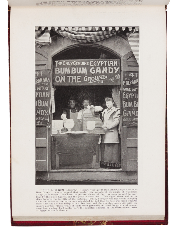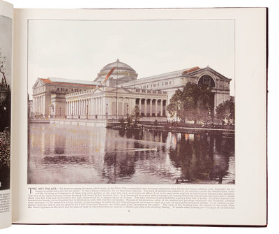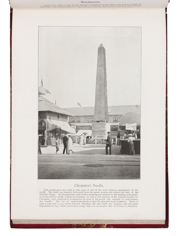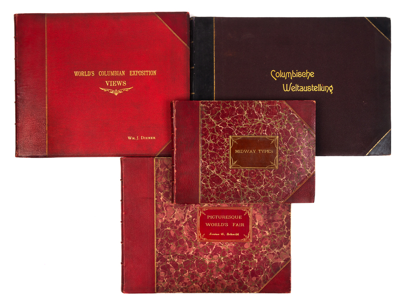 Part Six: Chicago Times Portfolio of the Midway Types. "Cairo Street" Number. Chicago: The American Eng. Co., n.d. Contemporary half red morocco, marbled boards, spine gilt, top edges gilt. -- Photographildie Anhdjten. Chicago and Berlin: The Jewell N. Halligan Company, 1894. Publisher's black and maroon morocco gilt. -- Picturesque World's Fair. Chicago: W.B. Conkey Company, 1894. Contemporary half red morocco gilt, marbled boards, spine gilt, top edges gilt. -- DIENER, William J. The Dream City; A Portfolio of Photographic Views of the World's Columbian Exposition. St. Louis, MO: N.D. Thompson Publishing Co., 1983. Publisher's red morocoo gilt, top edges gilt. -- Together 4 works in 4 volumes, oblong 4to and 8vo, condition generally fine.