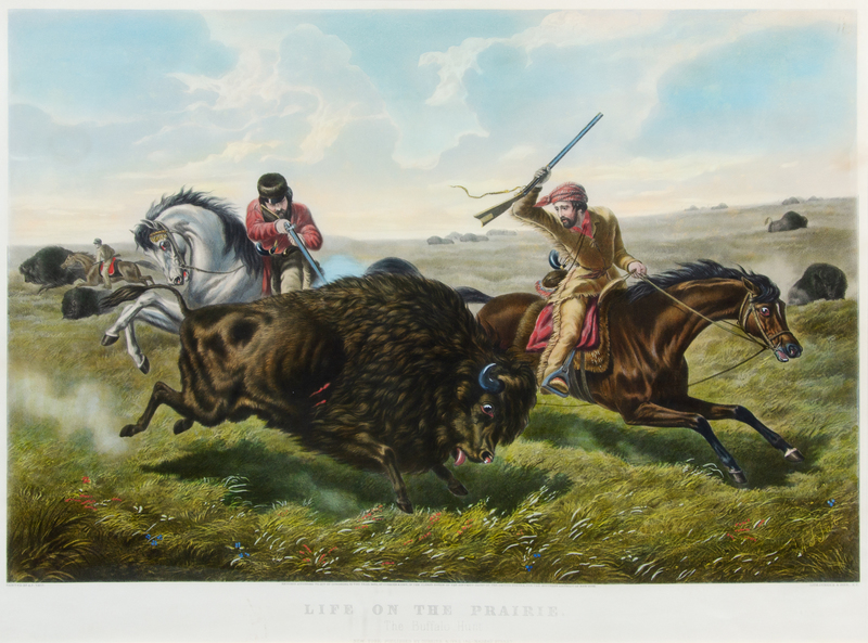 Life on the Prairie. Lithograph with hand-coloring heightened in gum arabic, 1862, image 468 x 689 mm (sheet 608 x 813 mm), verso browned and stained from old framing, some very pale mostly marginal spotting, a few very minor abrasions to sheet edges, matted and framed.