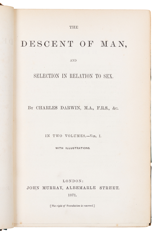 DARWIN, Charles (1809-1882). The Descent of Man and Selection in Relation to Sex. London: John Murray, 1871.