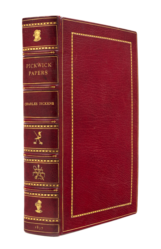 8vo (214 x 129 mm). Half-title; engraved frontispiece, engraved title, 41 engraved plates by R. Seymour and H. K. Browne ("Phiz"). (Some light spotting throughout.) 20th-century maroon morocco gilt, top edge gilt, others untrimmed, stamp-signed by Sangorski and Sutcliffe. FIRST EDITION IN BOOK FORM. Grolier English 78; Smith I: 3.