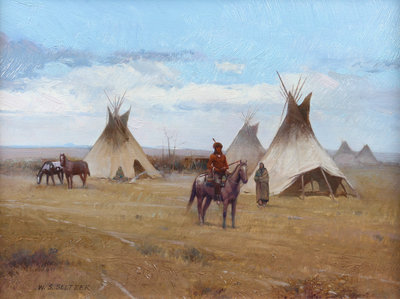 Encampment, oil on masonite, signed W.S. Seltzer (lower left)