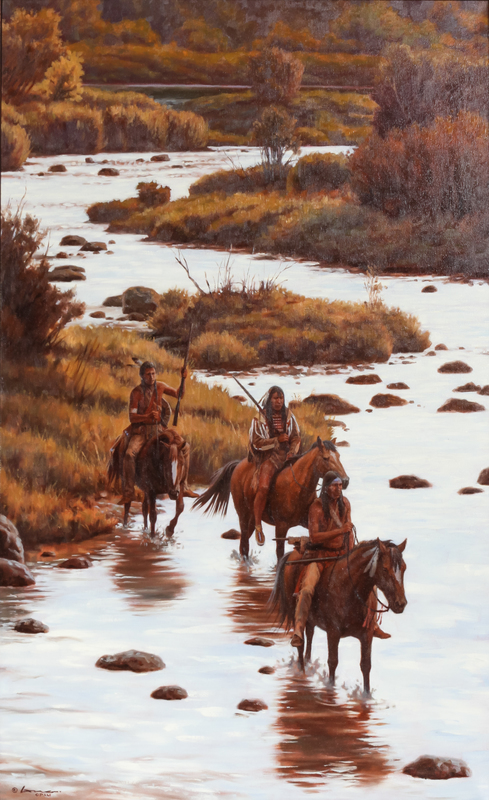 Crossing at Three Fork, oil on canvas, signed Lang OPAM (lower left)