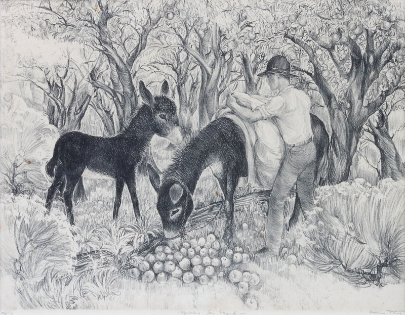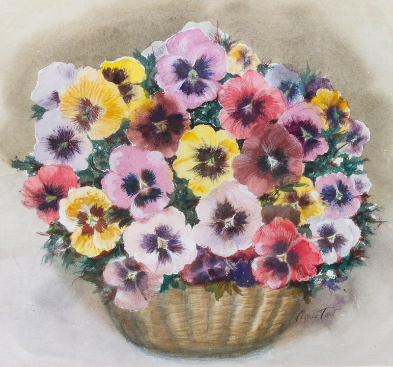 Pansies, watercolor on paper, signed Agnes Tait (lower right); together with Apple Picking, etching, signed Agnes Tait (lower right)