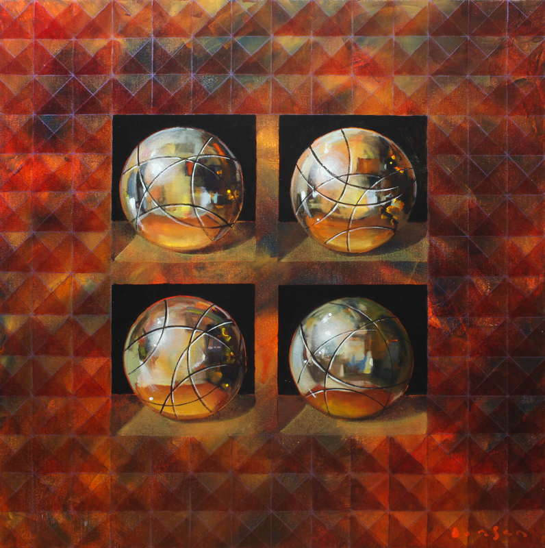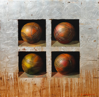 Leather Bocce Balls and Silver Bocce Balls, mixed media on canvas, signed Jensen (lower right)