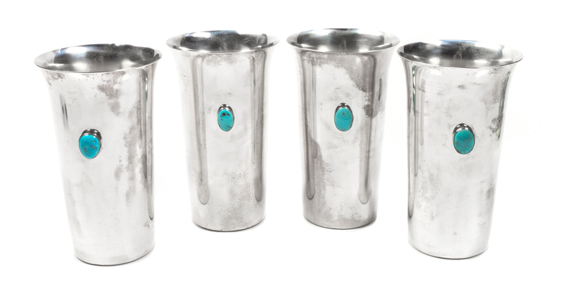 each tumbler stamped International Sterling with single turquoise cabochon applied by Edison Begay (Dine, b. 1954)