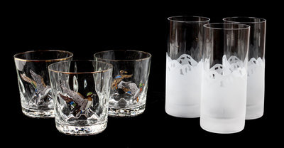 including eight etched mountain motif glasses and four sporting motif old fashioned glasses