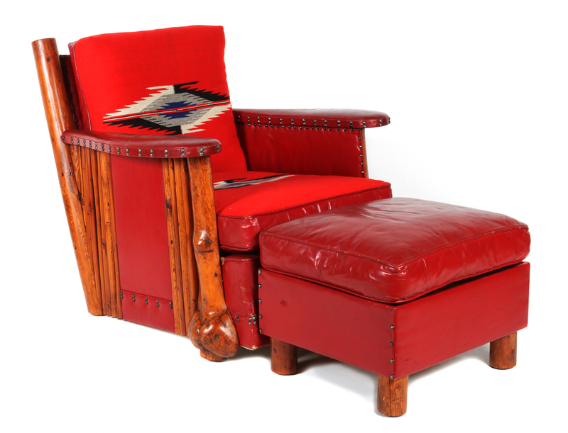 Circa 1944, club chair and ottoman with burled fir, Chimayo wool weaving, red leather and hammered steel tacks