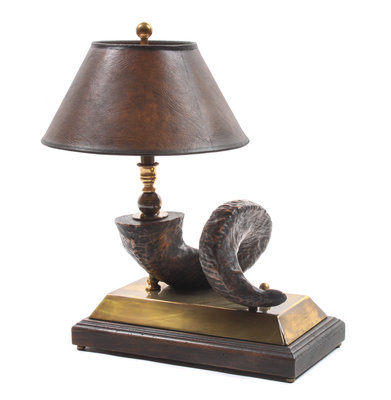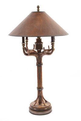 one brass and antler lamp and two rustic bark lamps