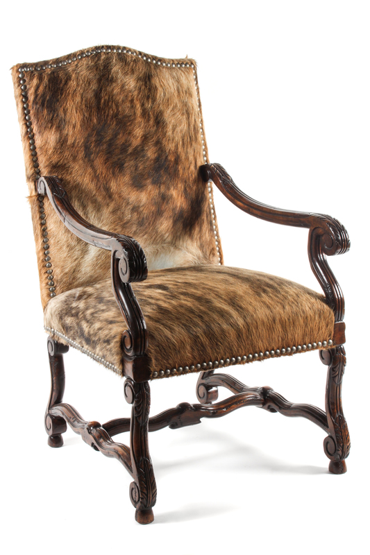 with hide upholstery and brass tacking