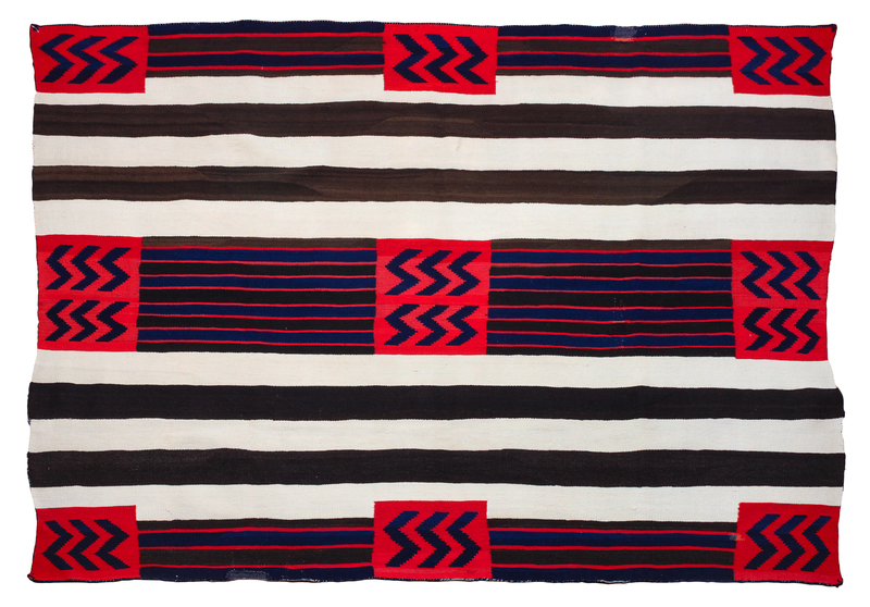 featuring a nine block design containing zig-zag motifs. Composed of natural brown and white handspun wool, indigo blue and cochineal dyed ravelled bayeta red.