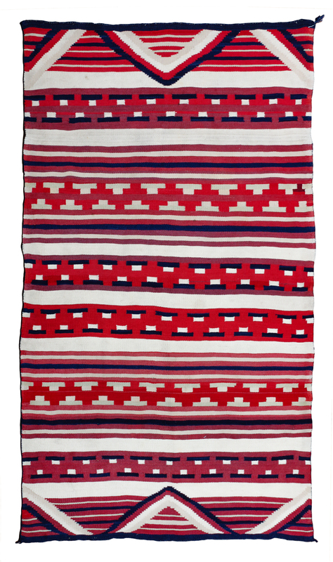 having alternating banded design interspersed with T-form motifs. Composed of cochineal dyed Saxony and ravelled bayeta yarns and indigo blue.