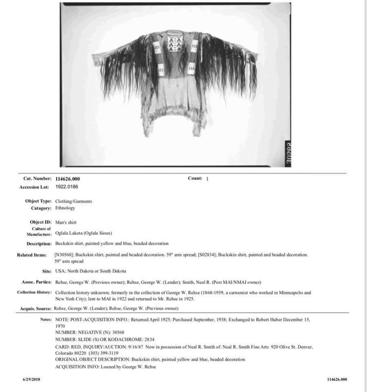 constructed of native tanned hide (buckskin) and painted in typical Sioux colors of blue and yellow representing earth and sky. Fringed with horsehair, tightly beaded strips and bibs in an early poncho style cut. Heye Foundation collection number 114626 listed on interior just below the collar.