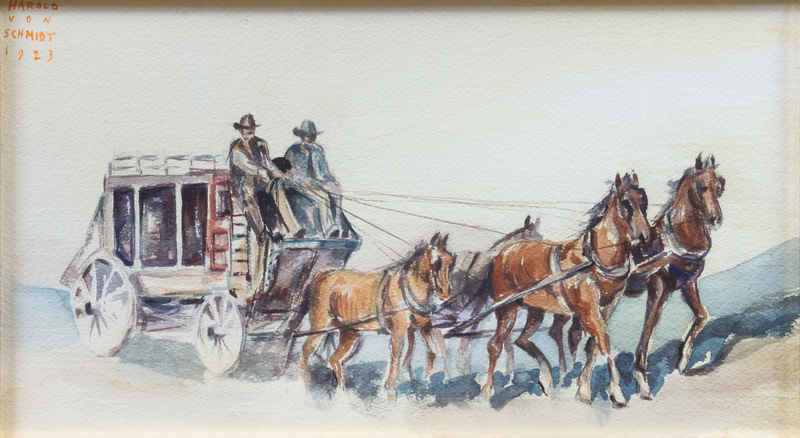 Stagecoach, watercolor, signed Harold Von Schmidt and dated 1923 (upper left)